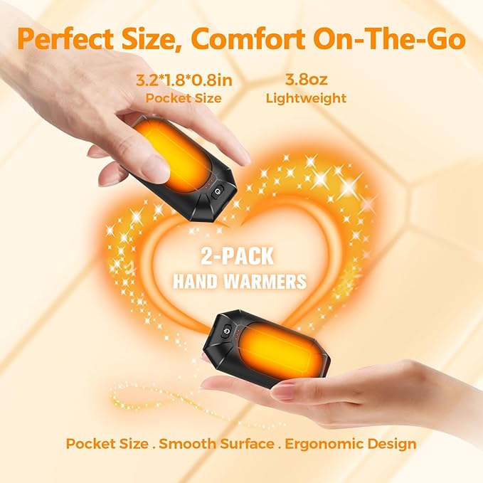 - [This Winter is Not Cold Outdoor] With a slim 0.8-inch thickness, the 2023 pocket rechargeable hand warmers effortlessly slip into pockets or gloves. Weighing only 1.9oz each, they're ideal for outdoor activities like golf, fishing, hiking, camping, sports matches, dog walks, travel, and hunting. Perfect as camping accessories, golf accessories for men, or ice fishing essential, hiking gear and more. Stay warm and make every outdoor moment cozy with this rechargeable hand warmers!
