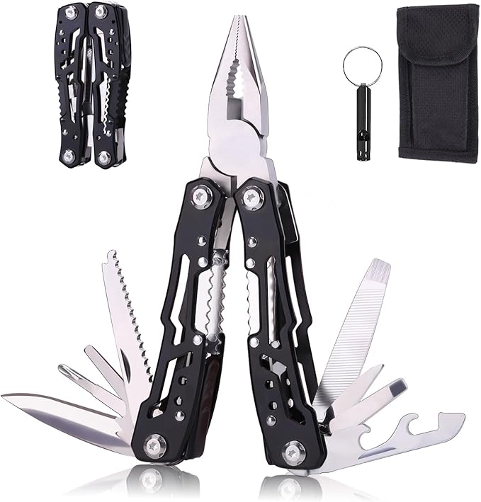 - 【LIGHTWEIGHT AND PORTABLE】Our portable pliers has a compact design, foldable structure, and lightweight weight. The complimentary nylon bag makes it easier to carry the tool in the pocket or tie it to the belt loop. This multifunctional pocket knife is an excellent choice for outdoor activities.