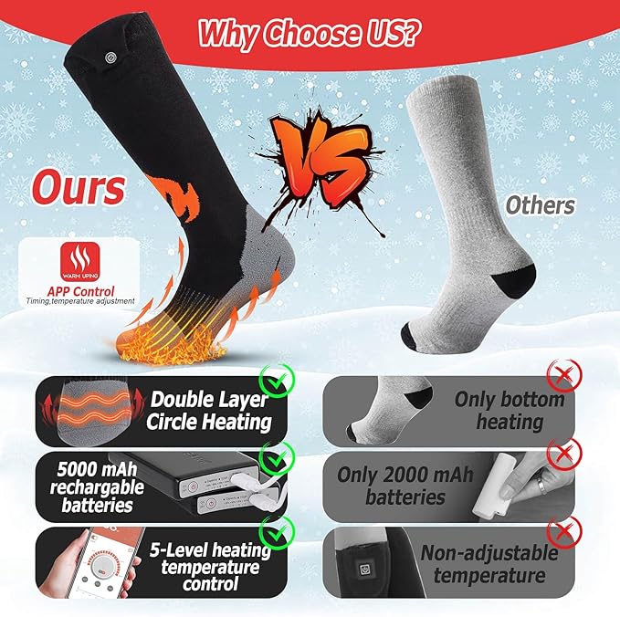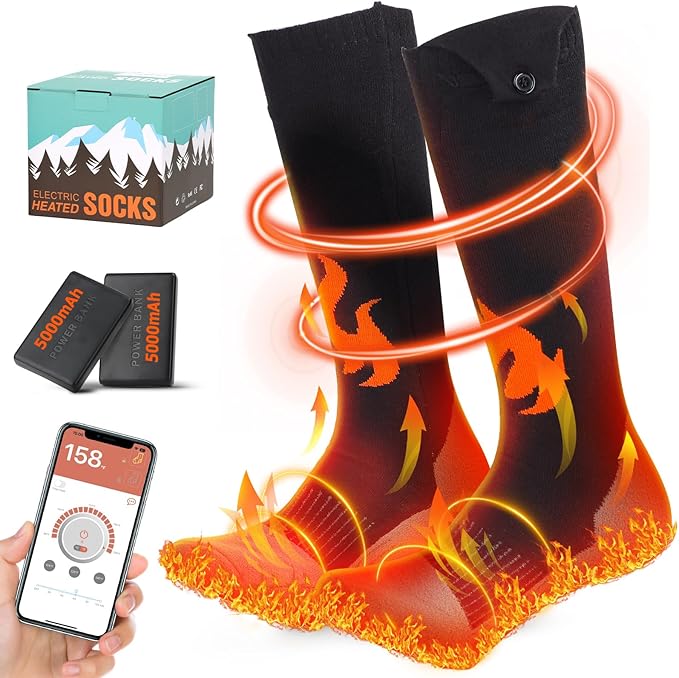 - 【2023 Upgraded Heated Socks with Smart App Control】The heated socks for men/women rechargeable utilize an advanced app control system through an intuitive app on your smartphone, allowing you to easily adjust the temperature settings, timer, the left and right socks separate temperature directly from your smartphone, no need for a extra remote control, offering enhanced convenience and flexibility.
