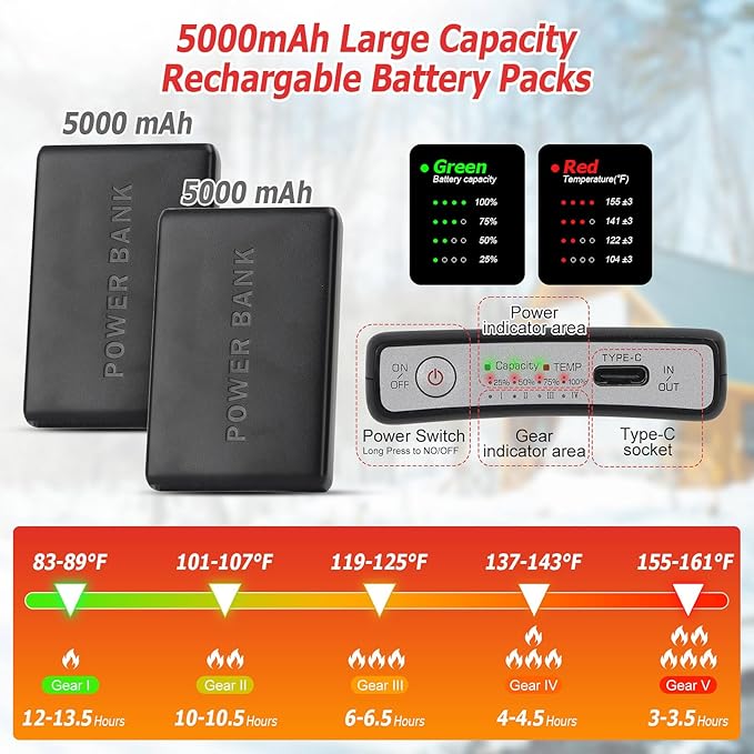 - 【2 x 5000mAh Large Capacity Battery Pack】Our electric socks for men rechargeable come with 2 portable 5.0V/5000mAh rechargeable batteries. The battery duration of the rechargeable heating socks is about 4 hours on the highest temperature gear 158°F and is up to 11 hours on the lowest temperature gear 86°F, providing long-lasting, continuous warmth without the need for frequent charging.
