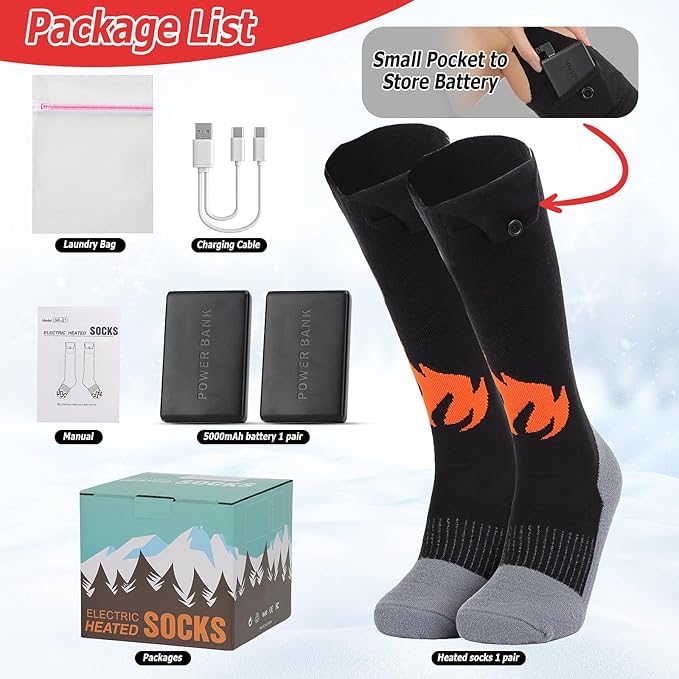 - 【Perfect & Versatile use】 Our electric heated socks are packed by a beautiful box, perfect for families and friends on Christmas, birthdays, Thanksgiving days. These heated socks for men rechargeable are not limited to just one type of footwear. They can be used in boots, shoes, slippers, or any other kind of closed-toe footwear, making them a versatile that can be enjoyed in various situations. It's a thoughtful that brings comfort and relief to someone's feet.