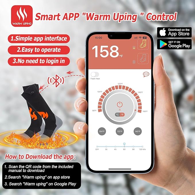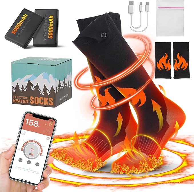- 【2023 Upgraded Heated Socks with Smart App Control】The electric socks for men/women rechargeable utilize an advanced app control system through an intuitive app on your smartphone, allowing you to easily adjust the temperature settings, timer, the left and right socks separate temperature directly from your smartphone, no need for a extra remote control, offering enhanced convenience and flexibility.