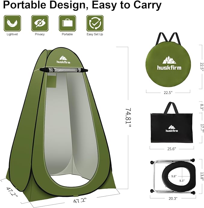 - 【Easy Assembly & Portable Toilet Kit】This camping toilet tent easy setup and folds easily in seconds without assembly and has an expansion size of 47.2” L x 47.2” W x 74.8” H, the toilet tent set can be fully stowed in our backpack, it's lightweight and easy to carry, suitable for outdoor camping, hiking and outdoor activities. Enjoy a hygienic toilet experience wherever you are.