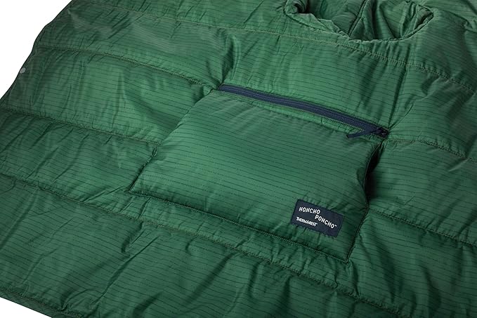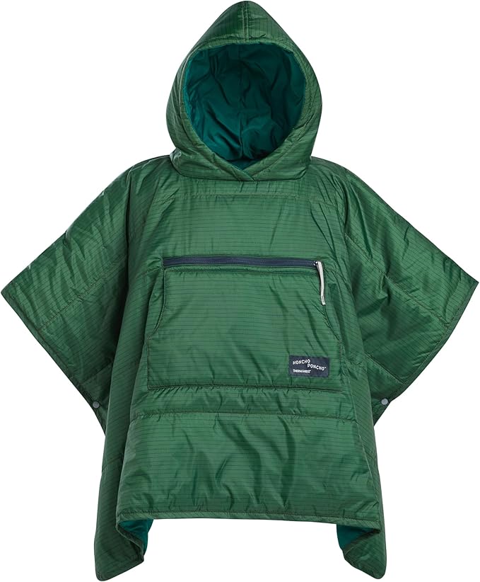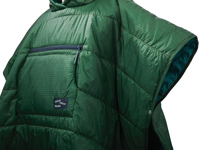 - Synthetic-insulated hooded poncho that can either be worn, or laid on the ground as a blanket