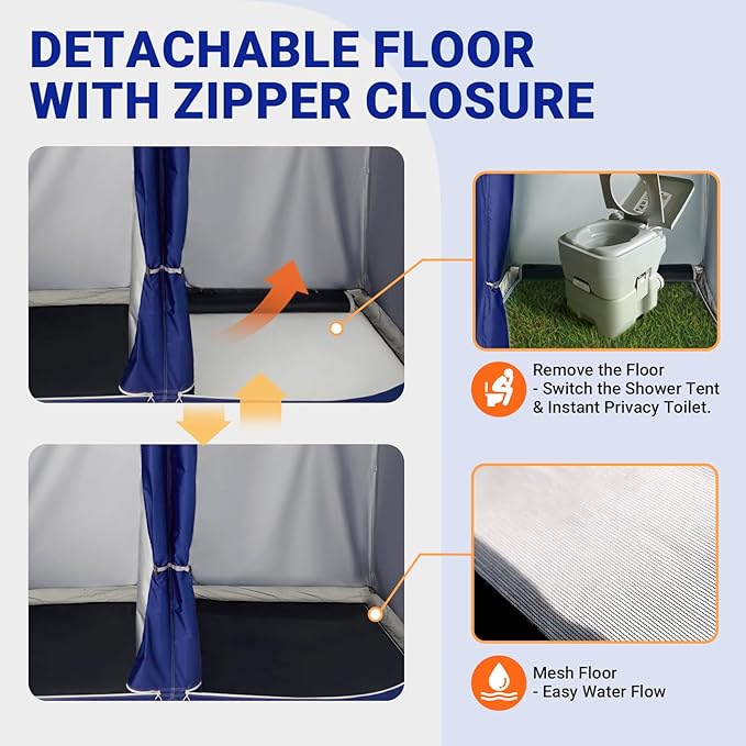 - EXCELLENT VENTILATION: Designed with large mesh windows for enhanced airflow, keeping the instant portable shower tent well-ventilated. The PE floor has zippers for easy drainage and mosquito protection. The floor can be opened to place a portable toilet, maintaining a clean and hygienic environment.