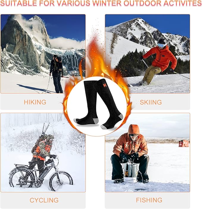 - 【Necessary for Winter】: The electric heating socks are great for kinds of outdoor activities in winter, such as fishing, camping, snowboarding, hunting, hiking, outdoor work, etc. Perfect gift for your parents and friends, free size for most people.