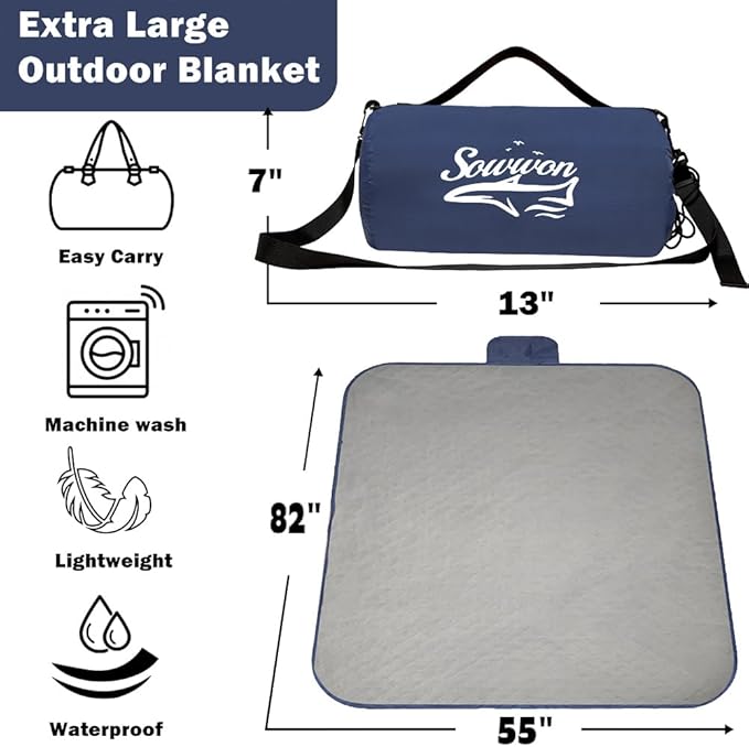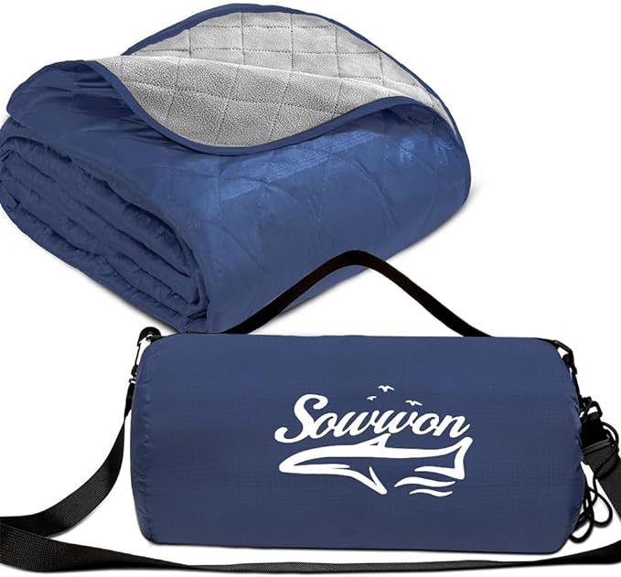 Waterproof Outdoor Blanket 82”X 55” Packable, Stadium Blankets for Camping with Quilted Fleece Lining, Large Windproof Emergency Throw Mat for Garss Picnic Hiking Road Trip, Machine Washable, Navy