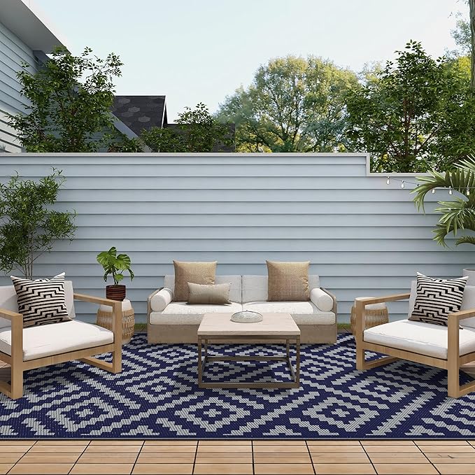 GENIMO Outdoor Rug for Patio Clearance, 6'x9' Waterproof Camping Mat, Reversible Plastic Straw Rugs for RV, Camper, Balcony, Backyard, Picnic, Deck (Blue & Grey)