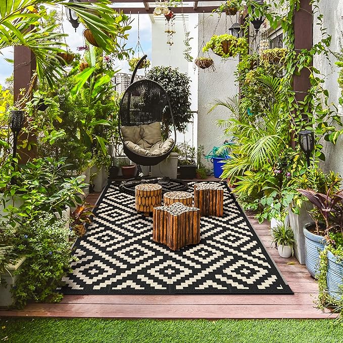 - 【All-NATURE & ECO-FRIENDLY】The indoor outdoor rug is made of environmentally friendly 100% virgin polypropylene. Edge heat treatment process to make the outdoor area rug edge firm. Tightly woven plastic technology will make your feet feel soft and protect your child's skin, grass and deck. The plastic rug fabric can withstand repeated wear and tear, you don't need to spend time maintaining it, which saves you a lot of time.