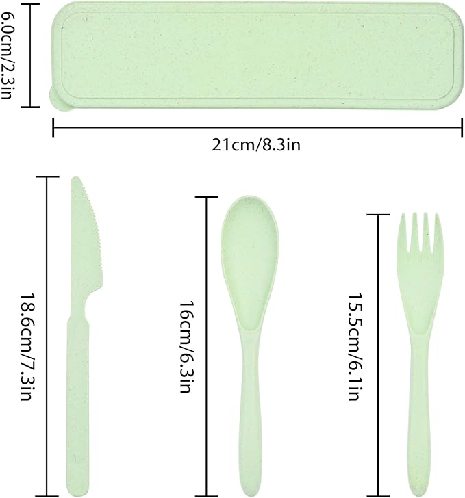 - 【Reusable Cutlery Set with Case】 Portable cutlery set is included one fork, one spoon, and one knife.Case box-21x6x2.5cm/8.3x2.3x1inch; Knife-18.6cm/7.3inch; Spoon-16cm/6.3inch; Fork-15.5cm/6.1inch.