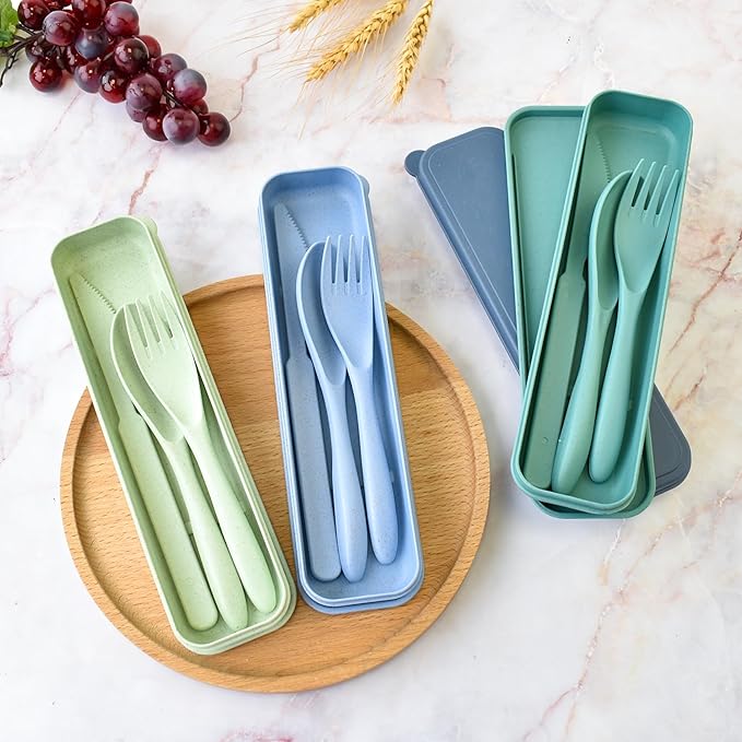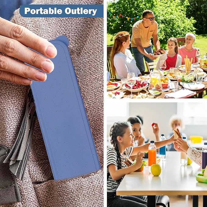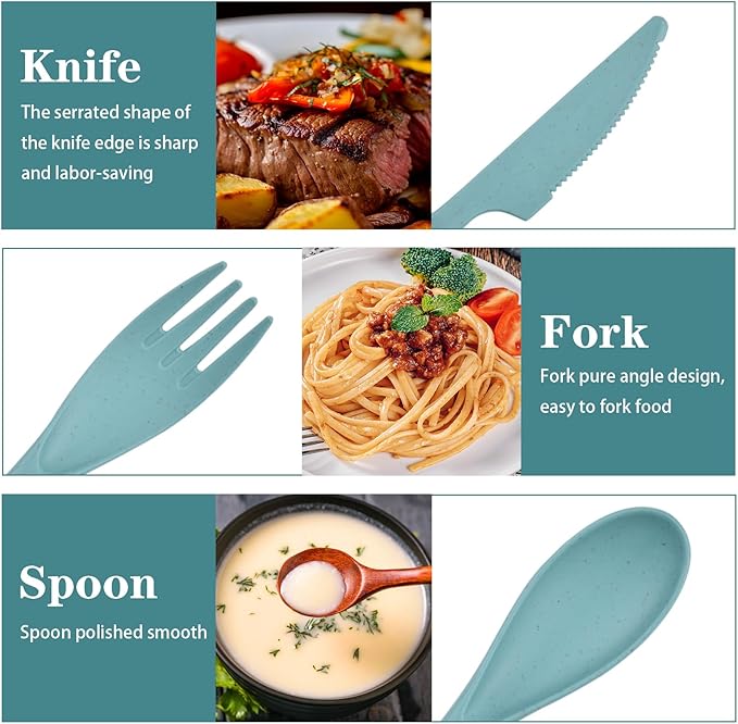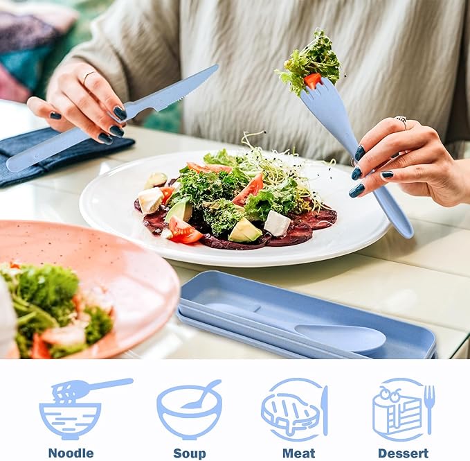 - 【Material and Portability】Our travel utensils are made of high quality plastic and reusable. Traditional stainless steel cutlery is too heavy and difficult to carry. Our flatware set is very lightweight.