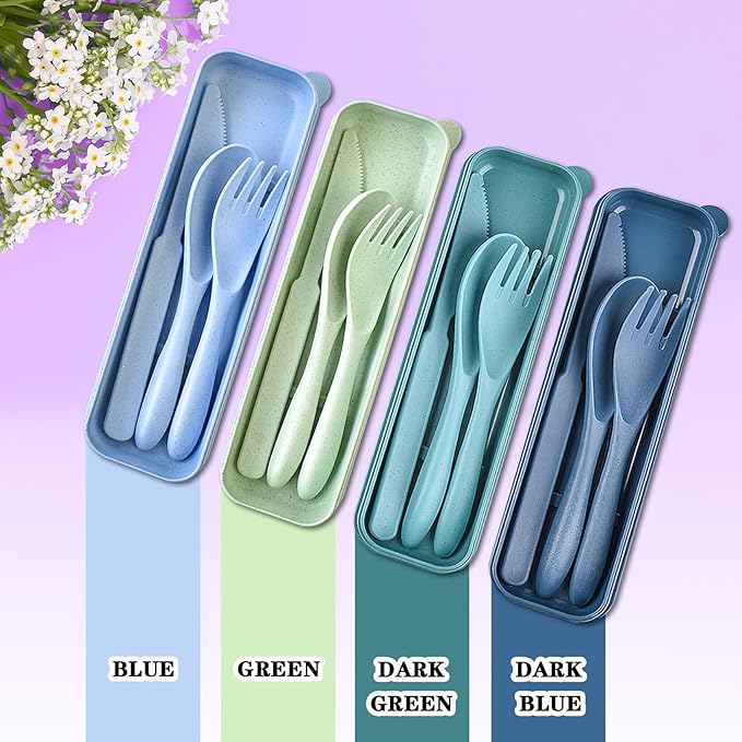 4 Set Reusable Utensils Set with Case, Travel Utensils with Case, Reusable Plastic Spoons and Forks Sets for Lunch Box Accessories, Portable Cutlery Set for Kids Adults Picnic Camping Work Use