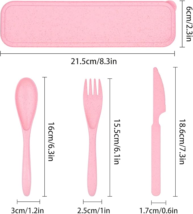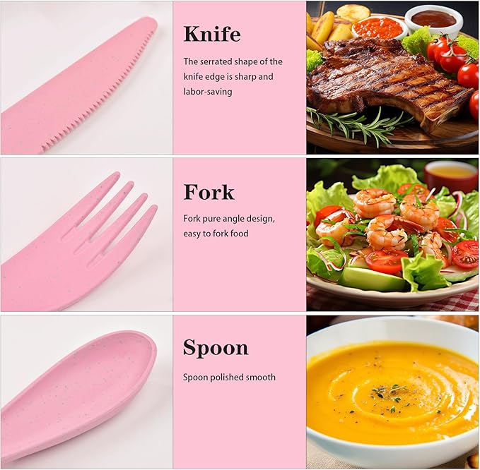 - 【Material and Portability】Our travel utensils are made of high quality plastic and reusable. Traditional stainless steel cutlery is too heavy and difficult to carry. Our flatware set is very lightweight.