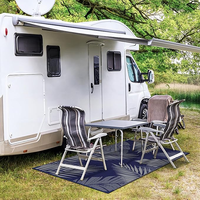 - Perfect Choice For RV Camping: Woven from lightweight plastic straws, these RV outdoor rugs can be easily folded down to a compact size to fit in our included carry bag. This portable waterproof outdoor rug allows you to take it outside easily, and also designed 4 corner loops with 4 stakes to help fix the carpet in place. Using this camper rug will relieve all the burden and fatigue of your RV trips and camping, allowing you to have plenty of imaginable space for more fun