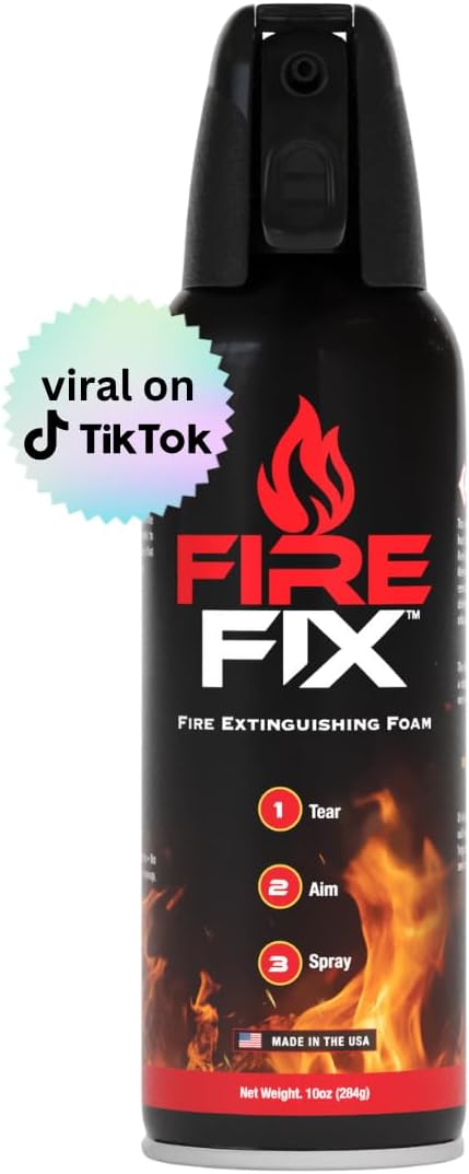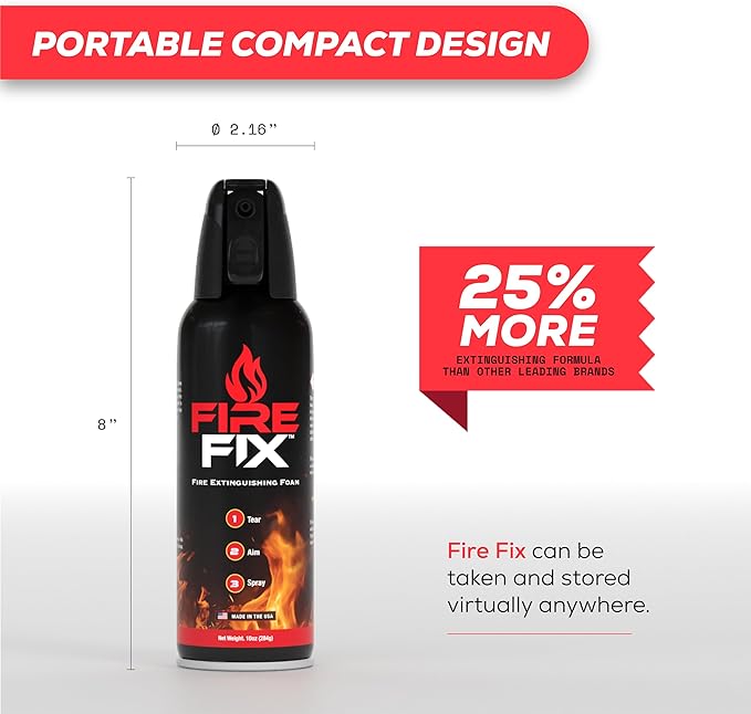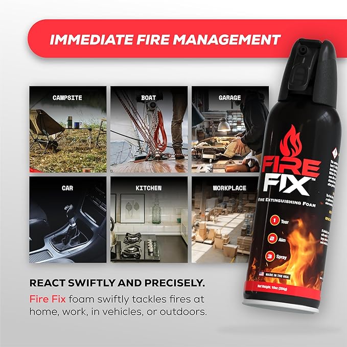 - Efficient and User-Friendly Performance: Combat fires effortlessly with the Fire Fix Fire Spray's intuitive design. Utilizing a revolutionary foam formulation, it rapidly expands to suppress fires, halting their progression effectively. Simply tear off the tab, hold the can at a distance of 3 to 4 feet from the fire, direct the nozzle, and spray to initiate firefighting action.