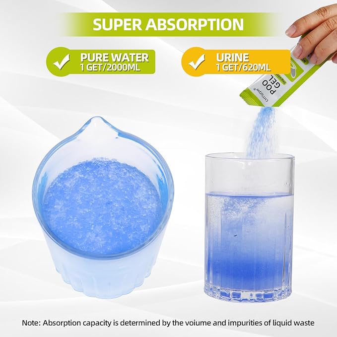 - 【PREMIUM ECO-FRIENDLY & BIODEGRADABLE Gel】Our Camping Toilet Chemicals gel powder is mainly made of a super absorbent polymer, which can absorb and retain extremely large amounts of liquid and gives off a light lemon scent, allowing you to always maintain an elegant environment. This absorbent gel can naturally degrade in soil composting within 7 days or in just 5 days when exposed to sunlight . It's an ideal choice for environmentally conscious travelers.