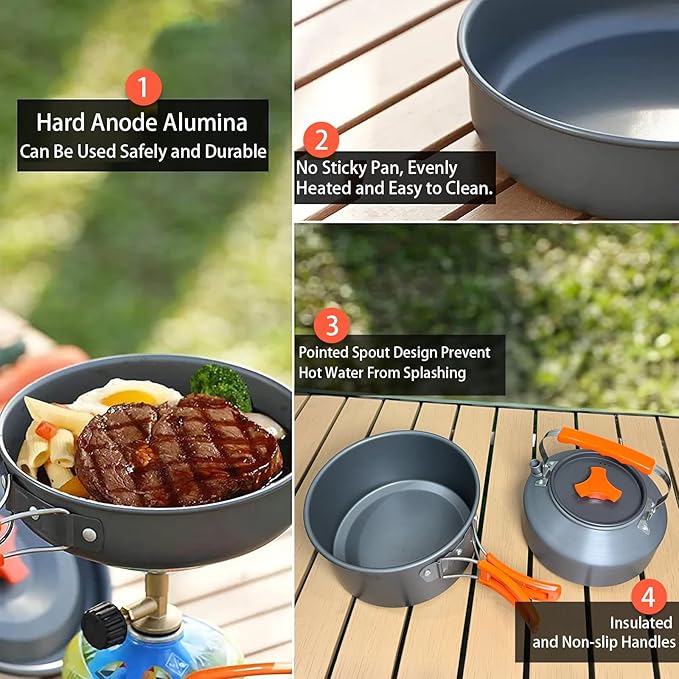 - Outstanding Quality and Service💁: We Are Committed to Providing Exceptional Product Quality and Attentive Customer Service. If You're Not Satisfied with Our Product, We Are Here to Assist You. Choose Our Camping Cooking Set and Make Your Outdoor Life More Exciting!