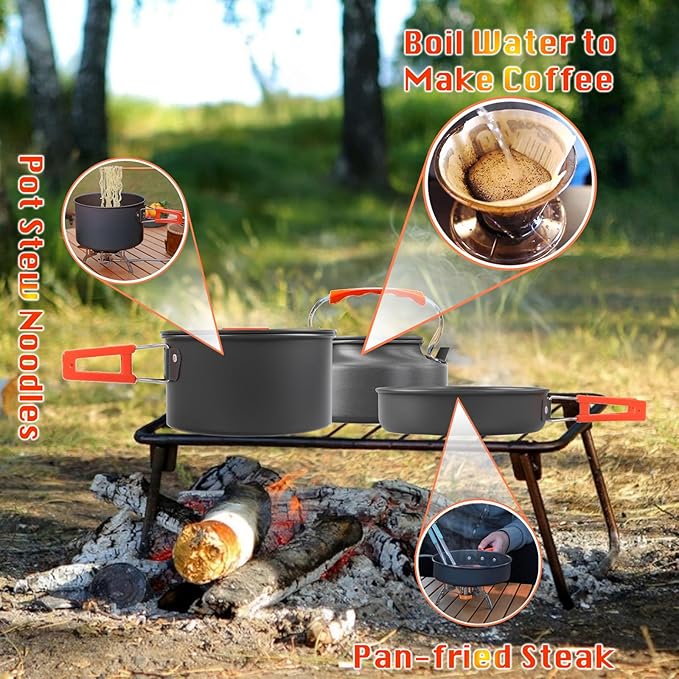 - Multifunctional Camping Pot Cooking Set🎯: Our Camping Cooking Set Is the Ideal Choice for Outdoor Activities. It Includes a Comprehensive Set of Cooking Tools, Such As Pots, Pans, Kettles, Multiple Transparent Bowls, Collapsible Soup Spoons, Rice Spatulas, and Cleaning Sponges. This Set Is Not Only Suitable for Boiling Water and Cooking But Also Perfect for Enjoying Delicious Camping Meals, and Handcrafted Coffee. So It's the Camping Gear Must Haves and Also for Rv Camping Must Haves.