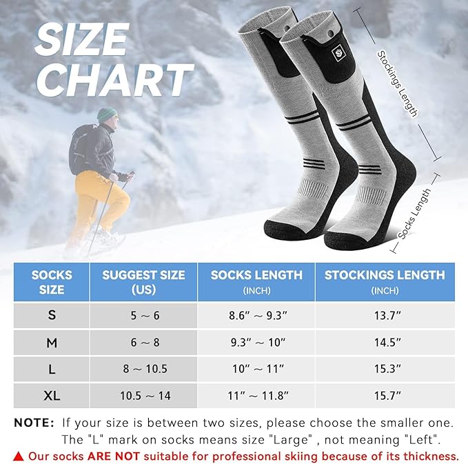 - 7*24 Hours&12-Month Warranty: We provide you with 7*24 Hours customer service and 12-Month warranty for our heated socks. If you have any questions about product, please feel free to contact us through Amazon messaging function