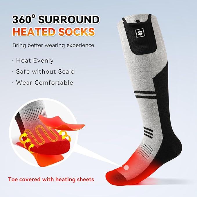 - Upgraded Heating Elements: Our electric heated socks use a new type of heating sheet. The design of heating sheet makes your socks heat up evenly and is not easy to burn your feet. Using our heated socks effectively help you improve blood circulation and reduce the coldness of your feet. Our heating socks are also suitable for people suffering from Raynaud's syndrome and arthritis, etc