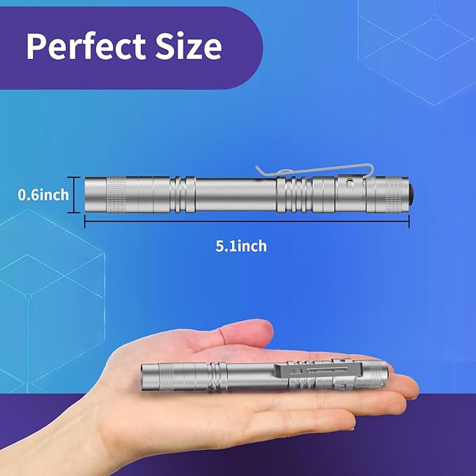 - ▶【LIGHTWEIGHT & METAL CLIP】Measure in 5.5*1.1*0.8inch, weight only 1.1oz/pcs, is extremely lightweight for daily use. With the removeable metal clips, this LED pen light can be easily attached to your belt, pocket, bag or hat, take it anywhere you go. Free your hands when doing works or repairing.