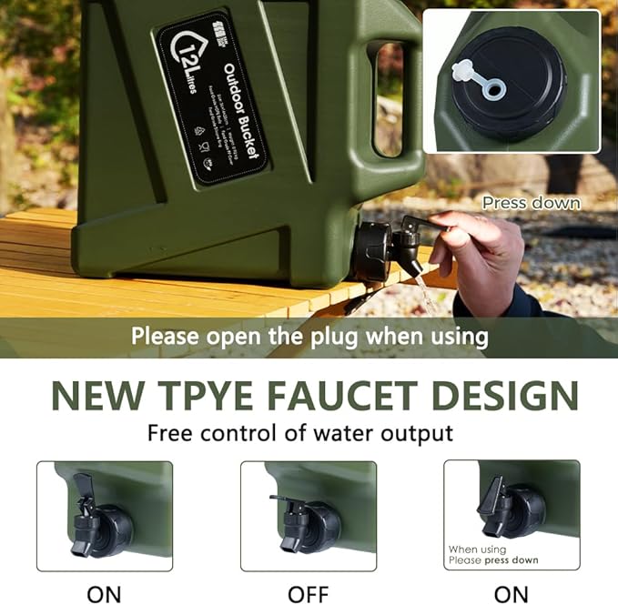 - 【Using No Burden】The 12L camping water jug without BPA no Leakage and is suitable for outdoor/indoor water storage. The cover/faucet/ sealing ring/ bucket body are made of food grade PP /silicone /HDPE material.Thickened Bucket body is wear-resistant, scratch resistant, sturdy and durable