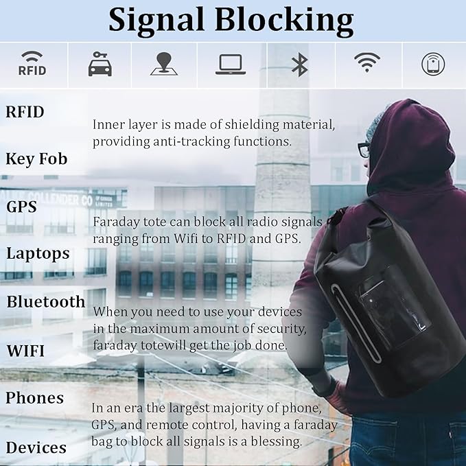 - đŻăVersatile Dry BagăOur faraday bags for phones use a double roll design to make it stronger and more durable, which is not only convenient for air-tight protection and stops water from entering the top of your bag during kayaking, boating, or fishing adventures, but it is also used for executive travel, personal security, EMP/CME protection.