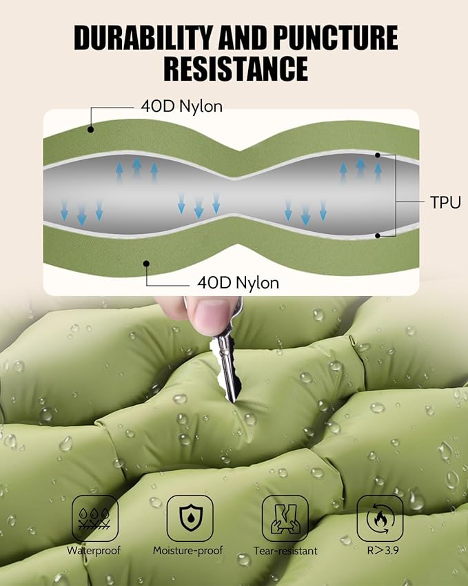 - 【Durable 40D Nylon Construction】Confidently embark on adventures with our durable sleeping pad. Constructed from 40D nylon, it offers increased thickness, tear-resistant properties, and a waterproof surface for resilience against the wild. Additionally, its surface is waterproof and easy to clean, ensuring a hassle-free outdoor experience.