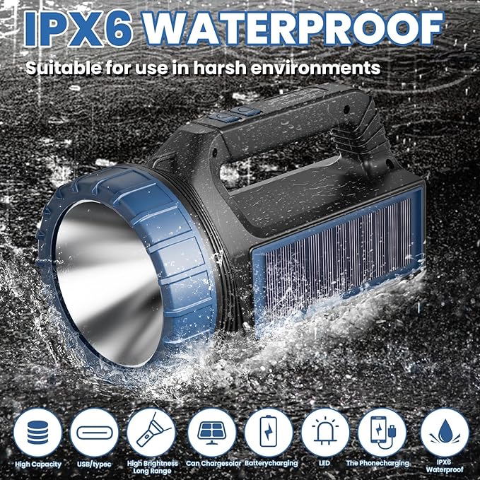 - 【HIGH QUALITY MATERIAL】: This handheld solar flashlights is made of high-strength engineering abs plastic, with a fully enclosed structure, explosion-proof, dust-proof, and shock-proof. Provides up to 2624ft/800m of light at night, capable of illuminating entire roads or mountains