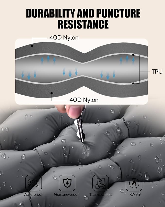 - 【Durable 40D Nylon Construction】Confidently embark on adventures with our durable sleeping pad. Constructed from 40D nylon, it offers increased thickness, tear-resistant properties, and a waterproof surface for resilience against the wild. Additionally, its surface is waterproof and easy to clean, ensuring a hassle-free outdoor experience.