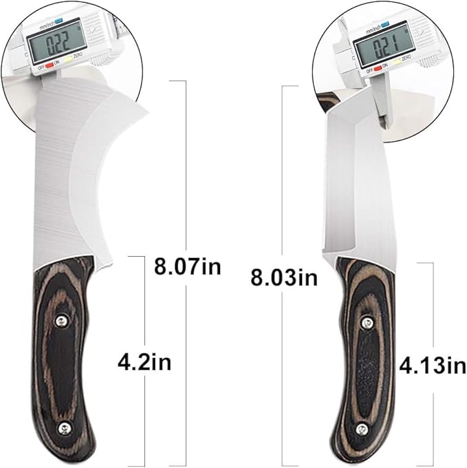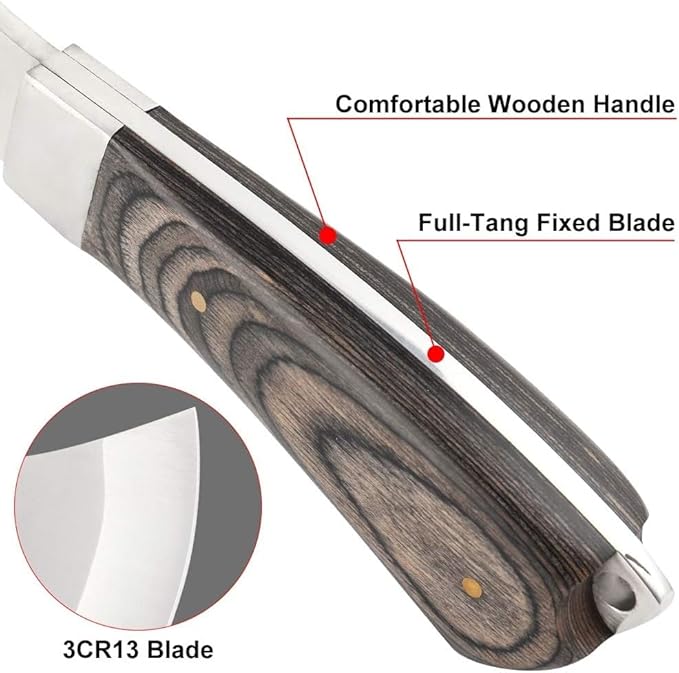 - Material: Stainless steel blade and wooden handle ,Hardness: 53 HRC ,Packaging dimensions: 14.76 x 1.38 x 10.51 inches ,Shipping weight: 3.22 pounds ,Package contents:1 x Camping knife set ,4 x Nylon sheaths