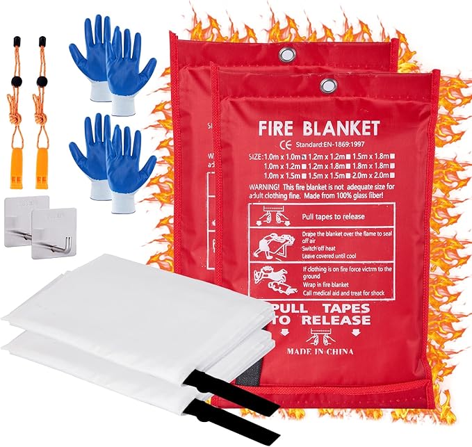 Emergency Fire Blanket 40" x 40" Fiberglass Fire Blanket Fire Suppression Blanket for Kitchen with Hooks Gloves Emergency Whistles Fireproof Blanket for Home Safety Camping (2)