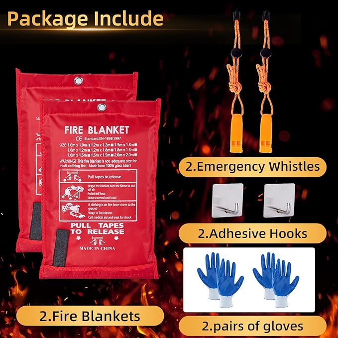 - Fire Safety Kit: you will receive fire blankets,emergency whistles, hooks, and gloves, to ensure optimal readiness in case of a sudden fire incident; Being prepared for emergencies, keeping your safety and convenience; With emergency whistle, you can quickly sound the alarm and gather your family in the event of a fire