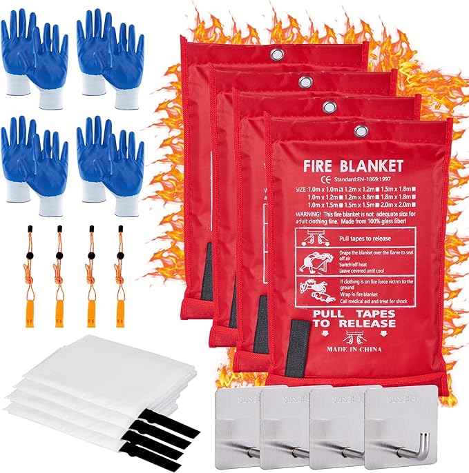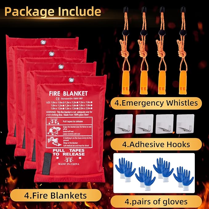 Emergency Fire Blanket 40" x 40" Fiberglass Fire Blanket Fire Suppression Blanket for Kitchen with Hooks Gloves Emergency Whistles Fireproof Blanket for Home Safety Camping (4)