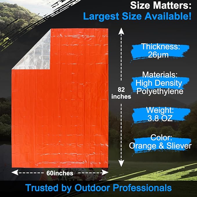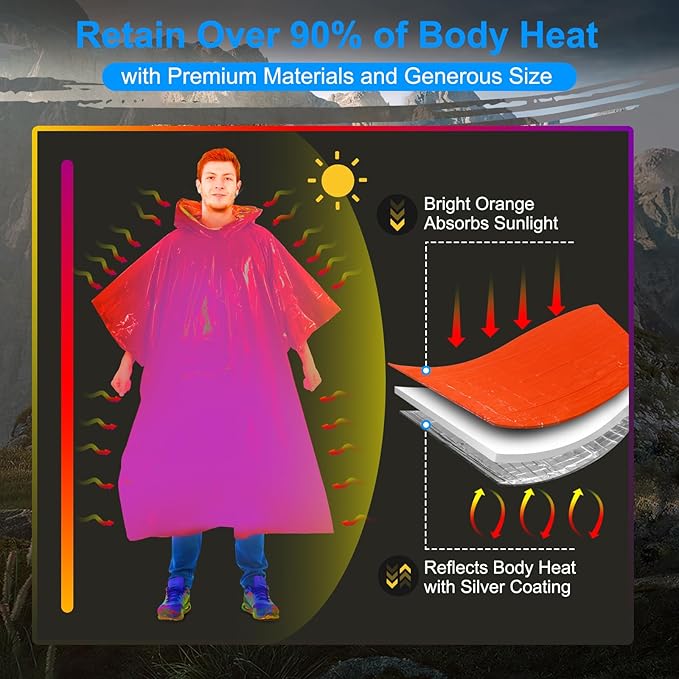 - MAXIMUM PROTECTION AND SIZE: Size Matters! The the emergency rain ponchos measure 53" x 51" and the mylar blankets measure 82" x 60", providing the largest size available. With a premium 26 μm thickness, they offer maximum protection, warmth and durability in any emergency.