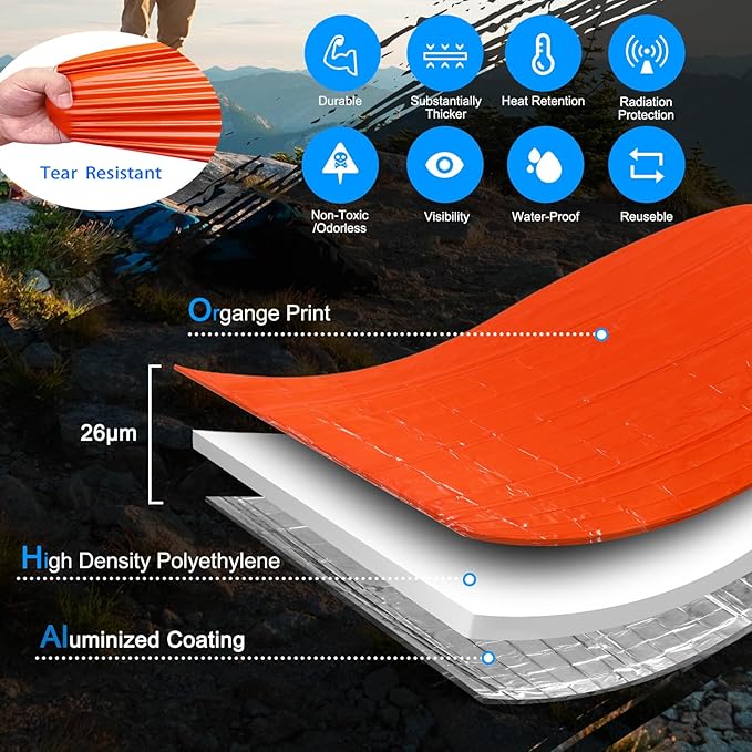 - VERSATILITY IN OUTDOOR SCENARIONS: Mylar space blanket is Perfect for hiking, camping, running, and first aid. O, yes, we also have ponchos! Heavy rain, snow, and windy conditions can be handled too. The orange color ensures high visibility, while the silver color offers reflective and heat properties.