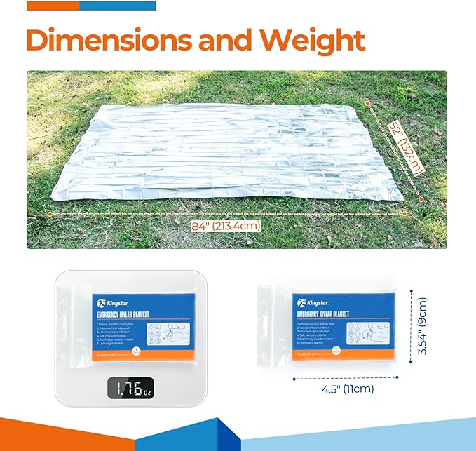 - LARGE DUAL SIDED SURFACE: The emergency blanket size is 52"x84", cover as much of head,torso,and limbs as possible,trapping body heat of human up to 6 foot 5 inch tall
