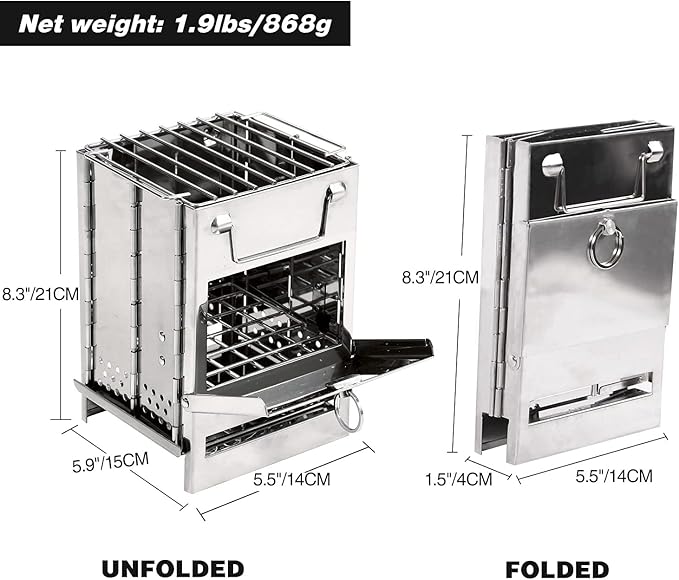 - FOLDABLE AND LIGHTWEIGHT: Easily collapsible and lightweight, Unfold size: 8.3*5.9*5.5in, fold size: 8.3*5.5*1.5in.Net weight: 1.9lbs. This camping stove comes with its own carry bag so you can sling it along and serve up a warm meal wherever you’ve set up camp