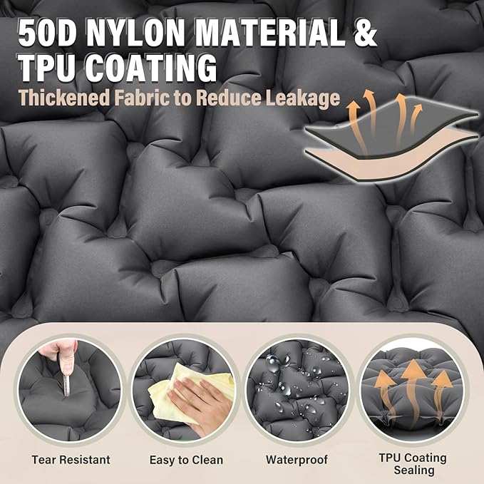 - 【50D Durable Ripstop Nylon】Made of lasting 50D nylon and TPU coating, 10D more than the old version, the camping mattress is waterproof, wear-resistant and more durable that is good for every weather, condition and terrain. It’s the best friend for camping, travel, hiking, fishing, climbing, etc. Weight Capacity is powerful enough to support, and just enjoy the sleeping pad while using it.