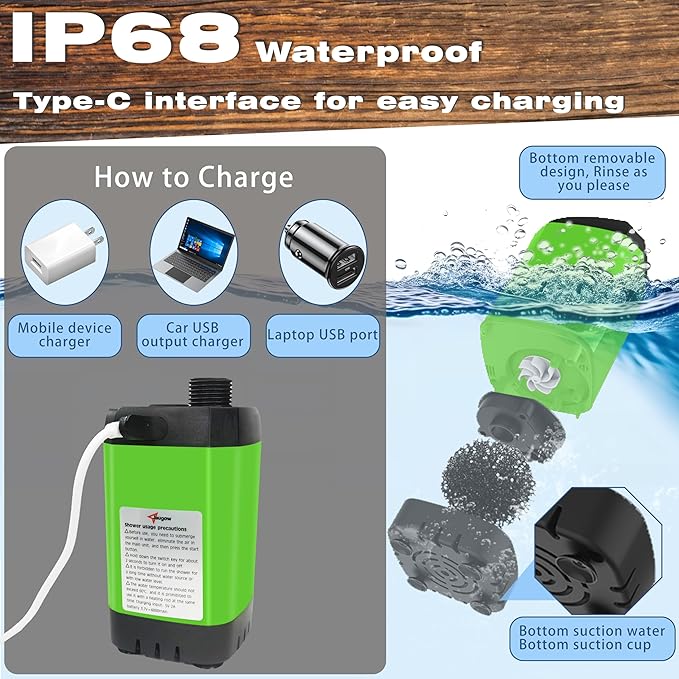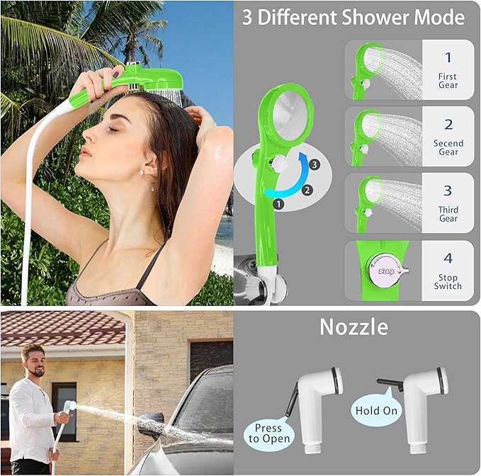 - [MULTIFUNCTIONAL DESIGN FOR VERSATILITY] Shower Pump Made Of High-Quality Materials, Ipx67 Waterproof, Protecting The Motor Safety And Able To Withstand The Harsh Requirements Of Outdoor Use. Hose Nozzle And Showerhead Bracket Adapt To Various Usage Scenarios. Whether For Showering, Washing, It'S Easy To Handle. Plus, The Portable Collapsible Water Bucket Makes Your Outdoor Life More Convenient.
