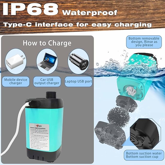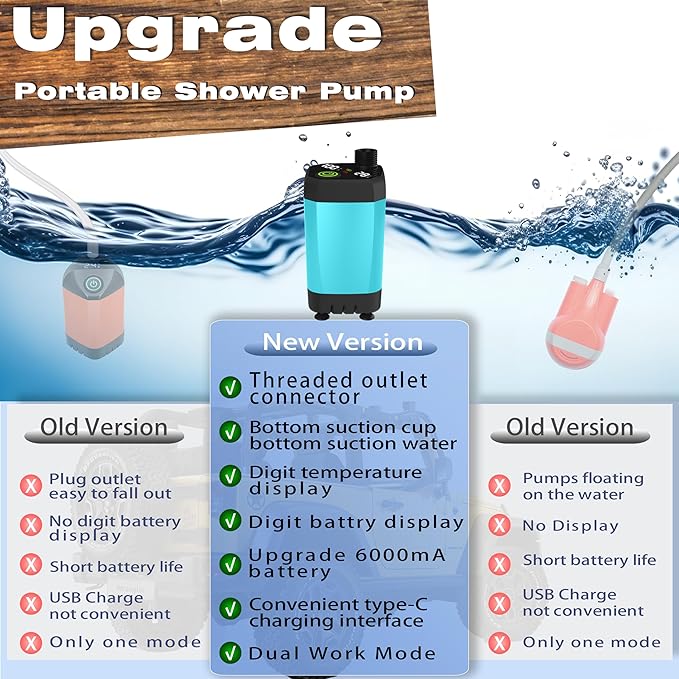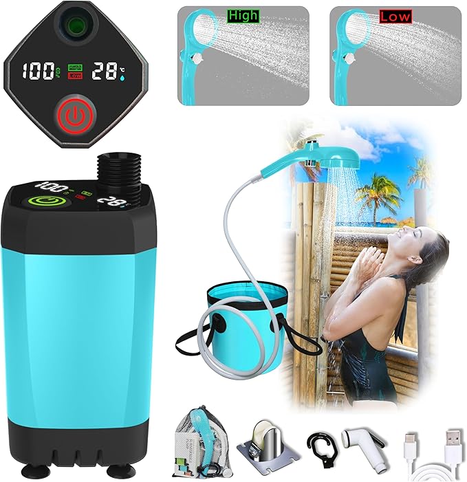 - [MULTIFUNCTIONAL DESIGN FOR VERSATILITY] Shower Pump Made Of High-Quality Materials, Ipx67 Waterproof, Protecting The Motor Safety And Able To Withstand The Harsh Requirements Of Outdoor Use. Hose Nozzle And Showerhead Bracket Adapt To Various Usage Scenarios. Whether For Showering, Washing, It'S Easy To Handle. Plus, The Portable Collapsible Water Bucket Makes Your Outdoor Life More Convenient.