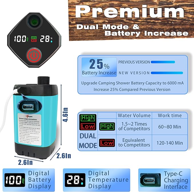 - [6000mAh RECHARGEABLE LITHIUM BATTERY] Camping Shower Pump Has A Built-In Large-Capacity Rechargeable Battery That Can Be Charged For 4 To 5 Hours And Can Work Continuously For 60 To 150 Minutes. It Is Not Only Environmentally Friendly And Energy-Saving, But Also Can Be Used For A Long Time Without Worrying About Power Problems. Suitable For Family Outdoor Travel, Group Camping And Other Multi-Person Use.