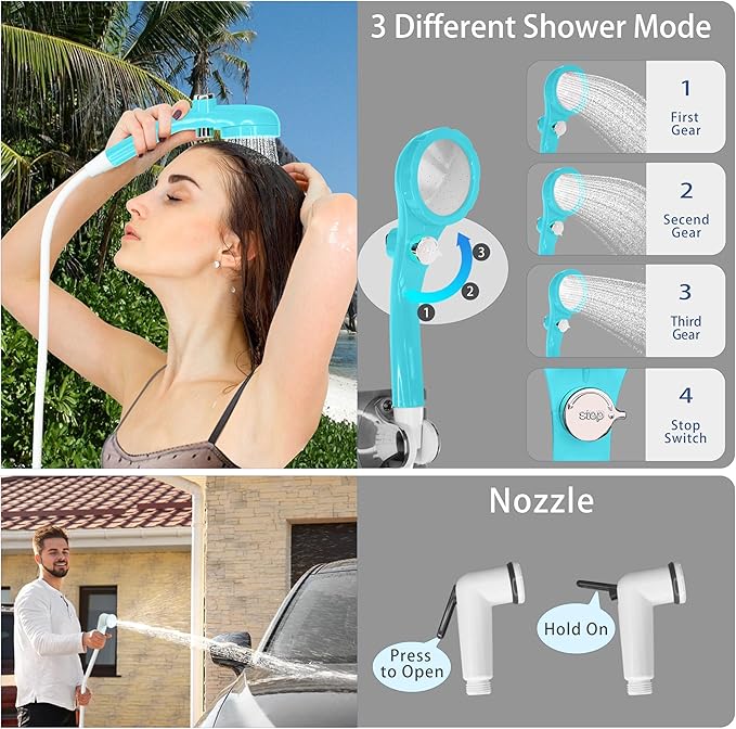 - [POWERFUL PUMP FOR CONSISTENT WATER FLOW] Equipped With An Efficient Camping Shower Water Pump And Bottom-Absorbent Design To Reduce Water Waste. The High and Low Dual-Mode Water Pump And Three-Speed Adjustable Water Pressure Shower Head Allow You To Adjust The Water Flow at Any Time According To Your Personal Preferences And Water Needs, And Enjoy A Customized Shower Experience.