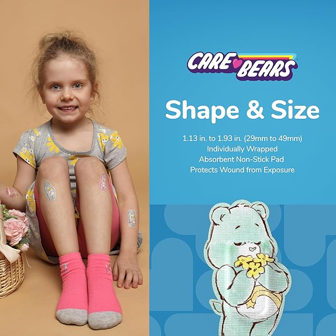 - CARE BEARS BANDAGES: This 24 piece pack of Care Bears bandages feature fun Wish Bear, Share Bear, and Cheer Bear shapes, and is great for putting a smile on kids' faces while protecting wounds such as cuts, scrapes, and burns; sticky bandages come in a cute cardboard box and are perfect for kids and adults alike, and also for school nurses and pediatric doctors