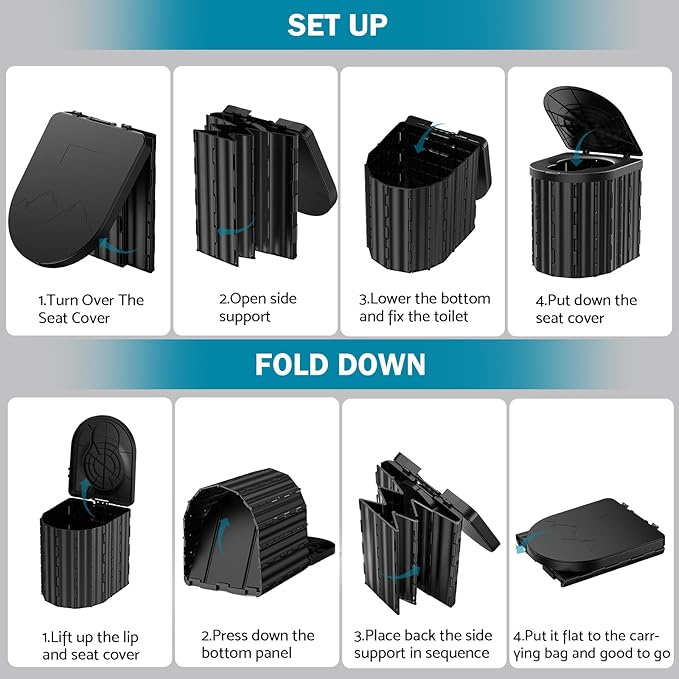 - 🚽【Easy Assembly, Includes Waste Bag】This porta potty for adults is extremely easy to install or fold away, can easily assemble it within 30 to 60 seconds, Convenient for quick use in emergency situations. Comes with biodegradable waste disposal bags that naturally degrade in about 180 days, Strong load-bearing capacity, Able to withstand approximately 5-6kg of garbage. At the same time, we provide a waterproof storage bag, You can easily put it in the car, luggage and backpack!