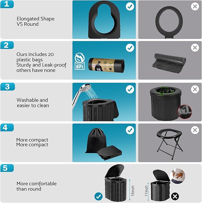 - 🚽【Unparalleled Comfort】The new Foldable Portable Toilet For Camping, Newly Designed Elongated-Shaped 12In Bucket Toilet Seat Is Just Like The One In Your Home. It Is Higher Wider, The Larger Size And Wider Portable Toilet For Adults Brings A More relaxed experience. Very suitable for male, female etc.
