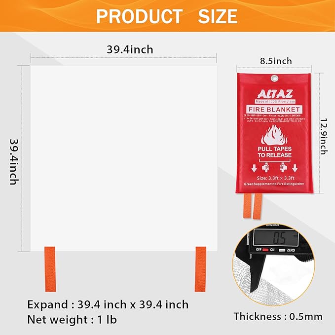 - 🔥【KEEP YOUR FAMILY SAFE】Safeguard your home and kitchen with ALTAZ upgraded emergency fire blankets. Designed as an emergency-prepared home safety device for peace of mind. You can put it on your body to escape from the fire scene. Gift Package: 1 Pack, blanket size is 39.4×39.4 Inches. Perfect as a great gift to your friends and family.