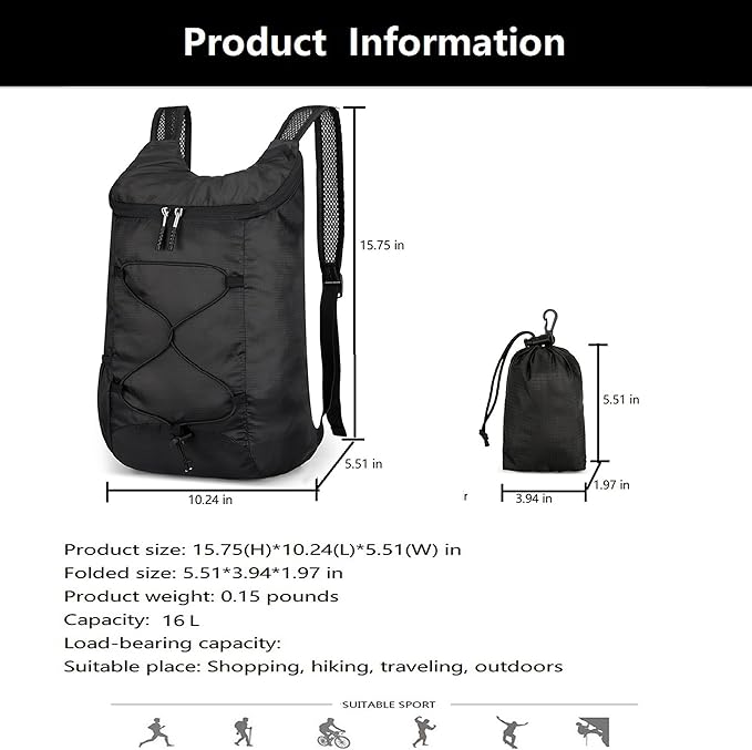 - LIGHTWEIGHT &16 L CAPACITY:The lightweight hiking daypack weighs only 2.82 ounces.unfold size: 10.23 (L) * 15.75(H)*5.51(W)inches,after folding size: 3.94(L)*5.51(H)*1.97(W)inches,the bag folds to the size of a sandwich and fits in a pocket.The main pocket to carry what you need,side pockets for water bottles or umbrella.