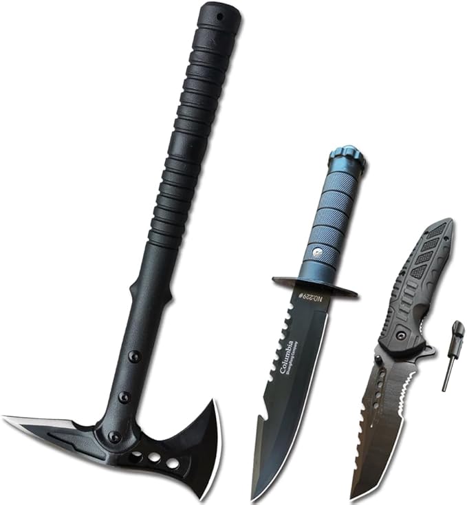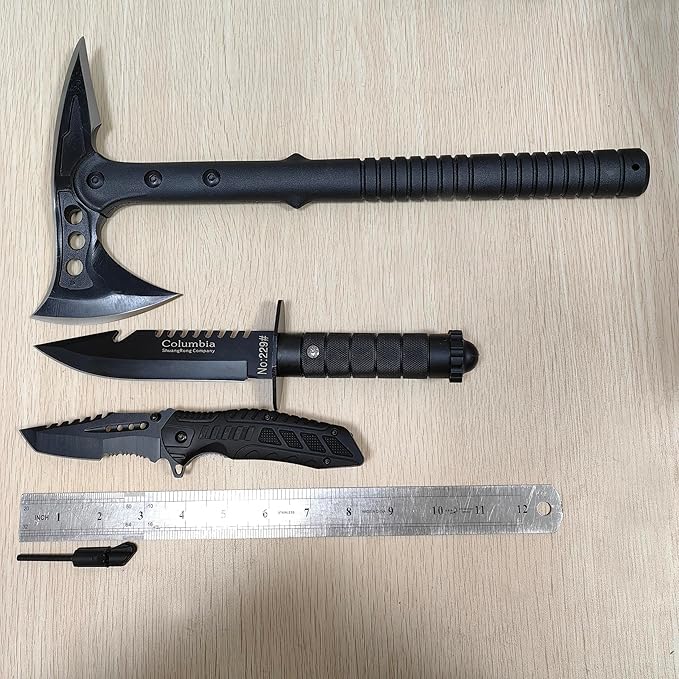 - 【Package Include and Size】:Axe:15.4" * 7.67 " / Fixed blade knife:11.1 " * 1.18 " / Pocket folding knife:8.3 " * 1.5 "