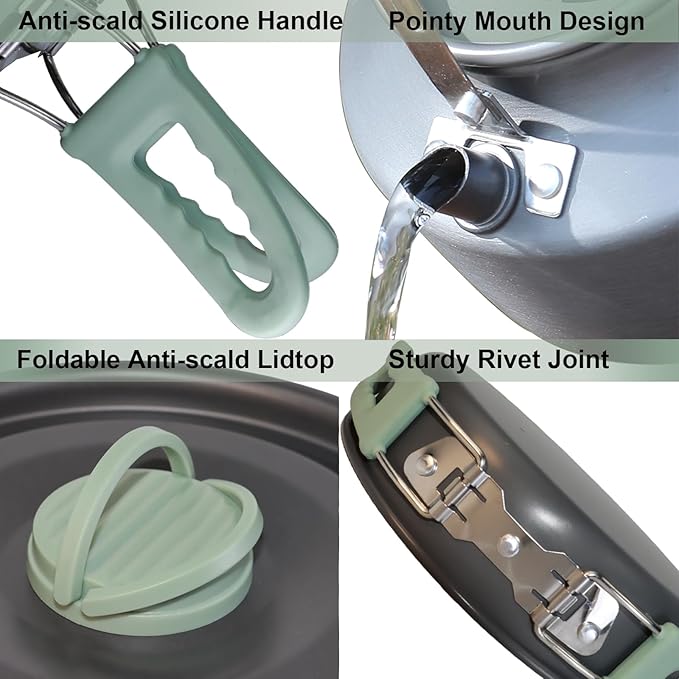 - Fast Heating and Safe Handling:The pot and kettle are made of food grade and fast heating conduction aluminum which is able to cook food or boil water very fast. It saves your time and can be very helpful to get ready for a fast meal during your camping or hiking trip. The handle is made of heat-resistant material and has a non-slip design to ensure safety. The bowl and spoon are made of food-grade materials, so you can use them safely.